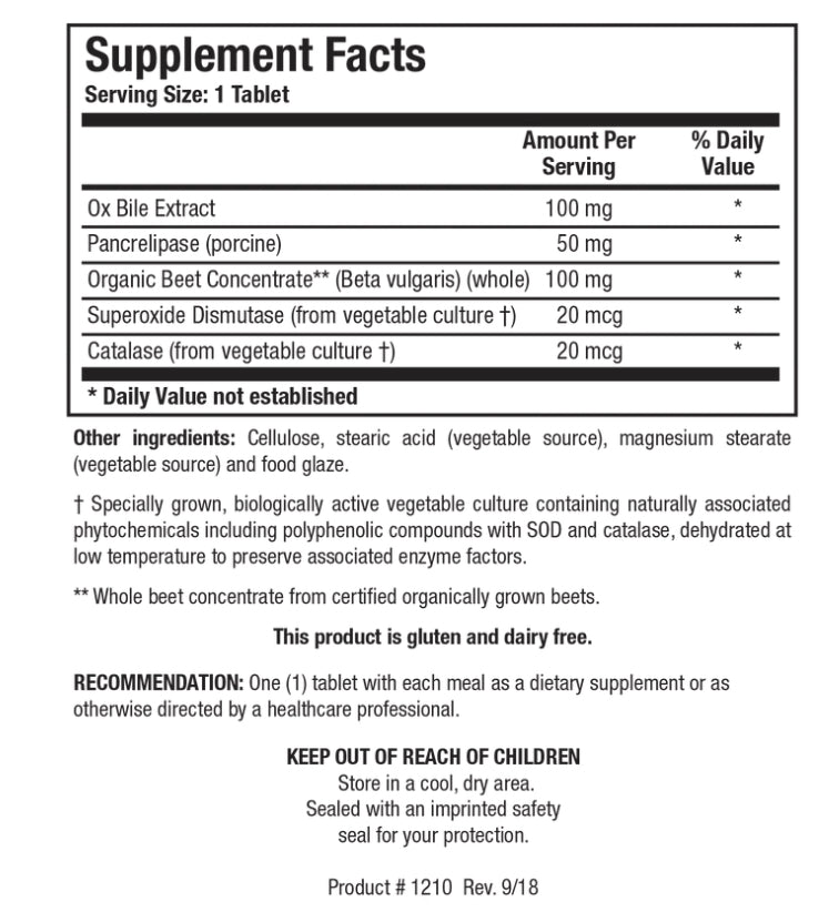 Beta Plus™ is a source of bile salts, digestive enzymes and organic beet concentrate, along with SOD and catalase. Consider this product whenever the gallbladder has been removed, or in situations when supplemental bile salts may be beneficial.